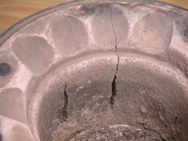 内側の大きなひび割れは七輪陶芸で、1200度ほどの強烈な高温にした時にできたものです。通常はここまでのひび割れは生じません。