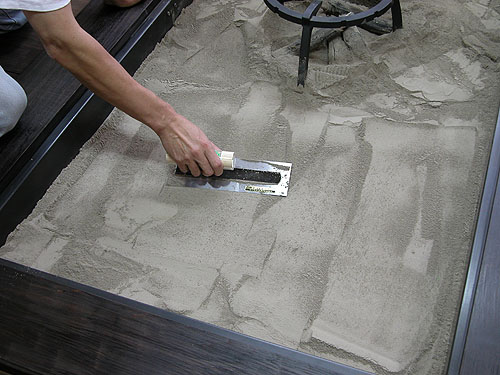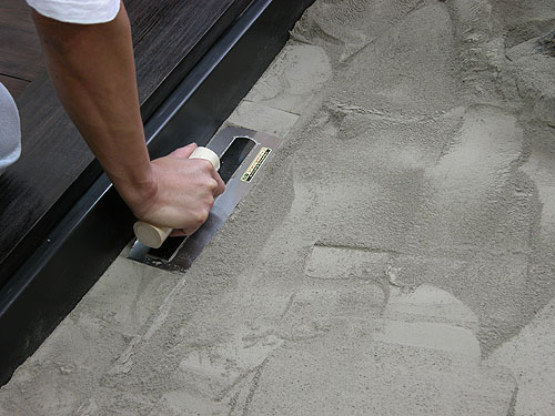 左官コテでさらに押し固め、セメントを塗るように「平ならし」します。