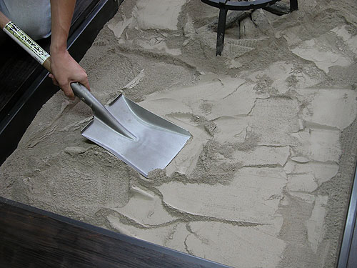 数十年の歳月を経ると自然と固まりますが、新たに灰を入れる場合は下記の方法で押し固めてください。また、押し固めた木灰は混ぜるとフカフカに復活します。