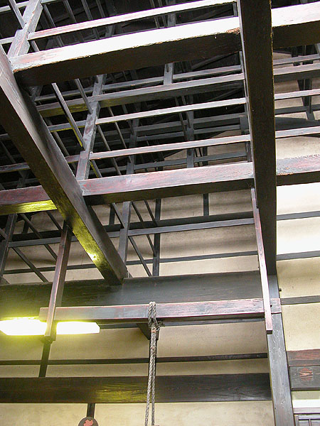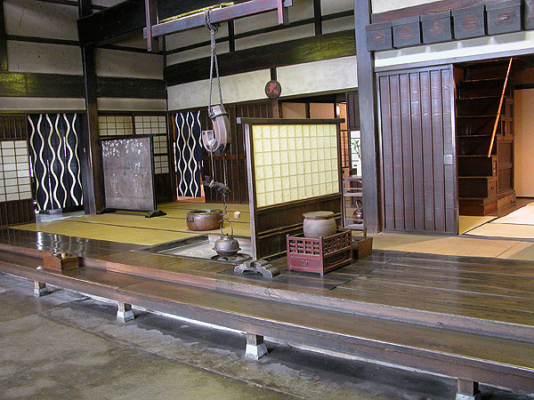 土間から囲炉裏の上部は見事な梁組み(立体格子)で、この広さと高さが豪商の証のようです。