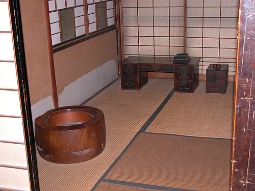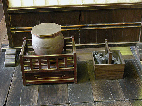 上に並ぶ箱は提灯(ちょうちん)箱で、豪商の玄関周りには大抵置いてあります。