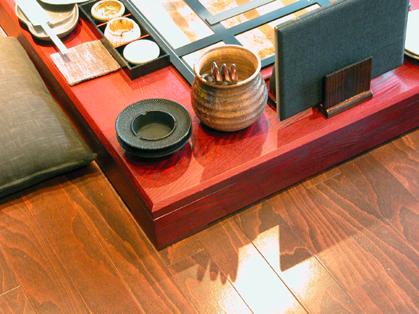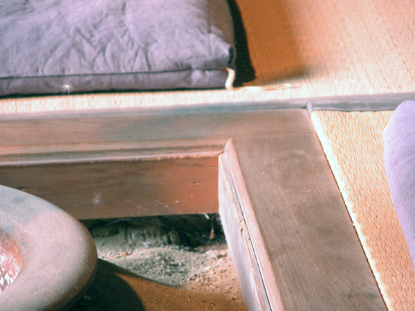 昔の囲炉裏は幅の狭い框が主流ですが、現在は食器類の置ける幅広の框が主流です。意匠的に広い框を嫌う場合は、お盆やお膳(箱膳)などを炉辺に置いて解決できます。