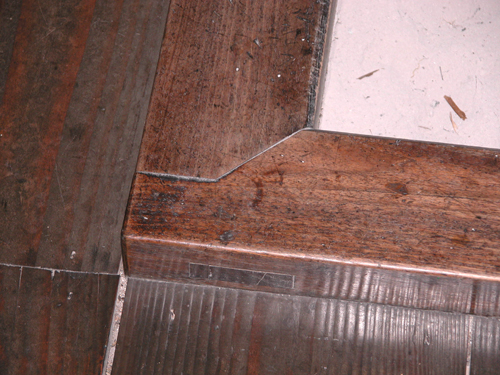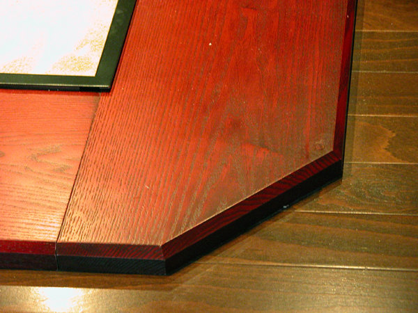 フローリングにのせる場合は、框の裏に凹溝を掘って、床に5mmほどの高さの木片凸を取り付けてはめ込みます。