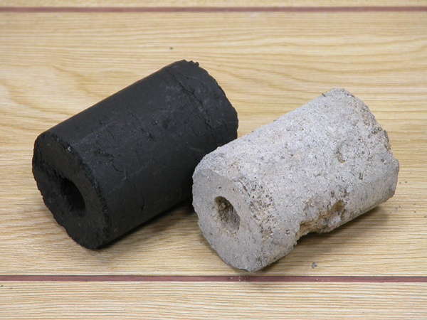 ほとんどのオガ炭は黒炭ですが、燃焼温度を1000度ほどにまで上げ、白炭化させたものもあります。(下写真参照)